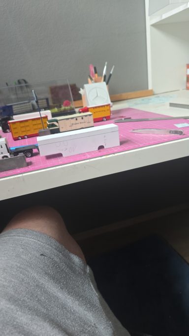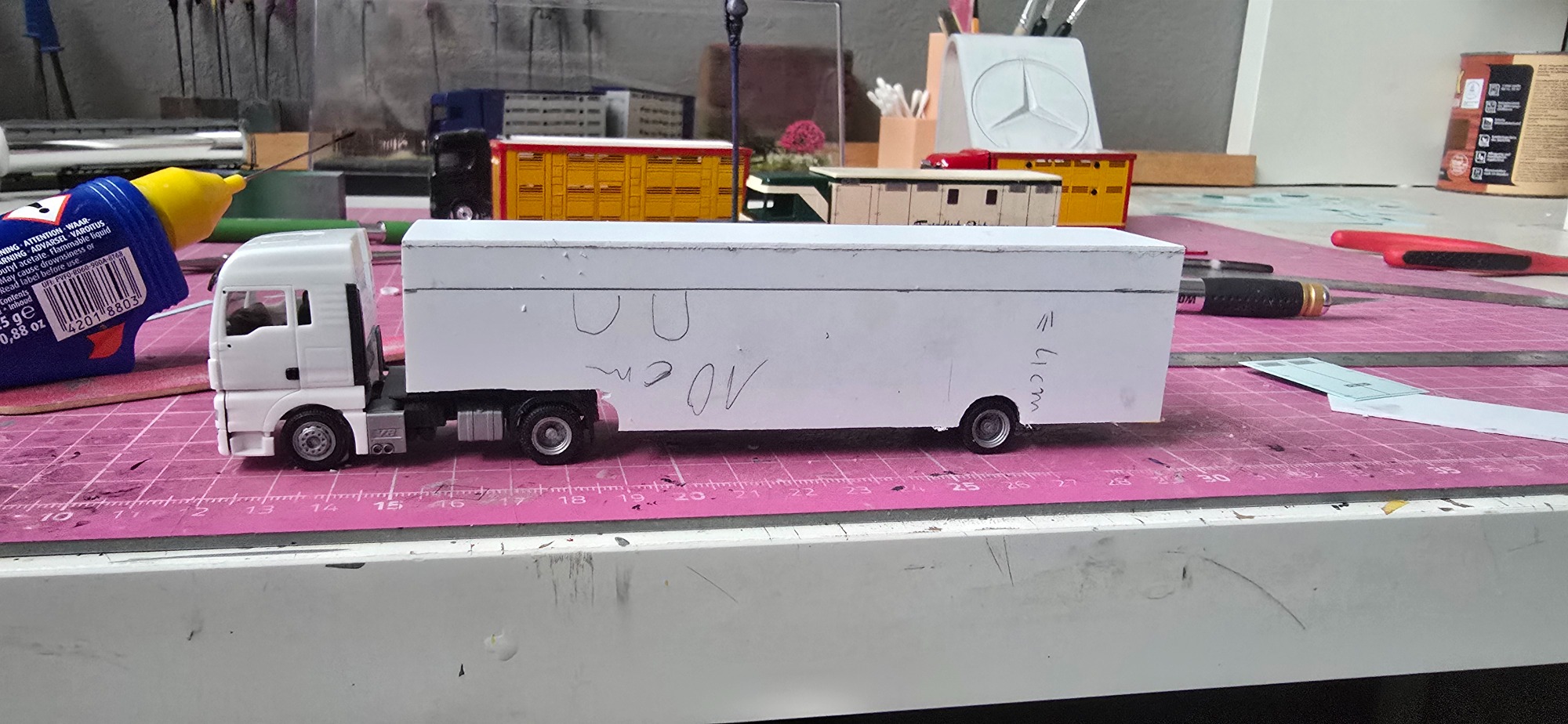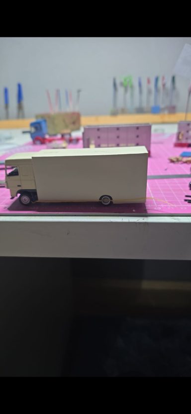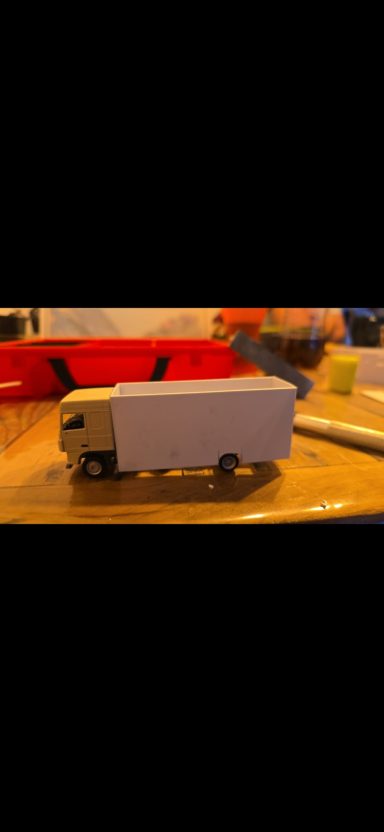 Auch Jan wollte ein weiteres Modell von seinen alten LKW. Er zeigte mir ein Bild davon worauf hin ich dann Teile suchte und bestellte. Also wurde die Zugmaschine geliefert in die Schmiede. Leider ist es nicht ganz die Richtige was ja nicht schlimm ist wenn man viele Leute kennt die einzelne Teile anbieten. Den 1 Achs Auflieger habe ich auseinander gebaut und schmaler und kürzer geschnitten, da ich den Aufbau selber baue für den Pferdetransporter Auflieger. Tage später habe ich mir dann die Platten zugeschnitten für den Auflieger und habe sie nach und nach zusammen geklebt. Nach dem der Kleber Trocken und fest war habe ich die Teile angepasst an den Klebekanten. Als der Aufbau fertig gebaut war habe ich alles geschliffen und Grundiert.