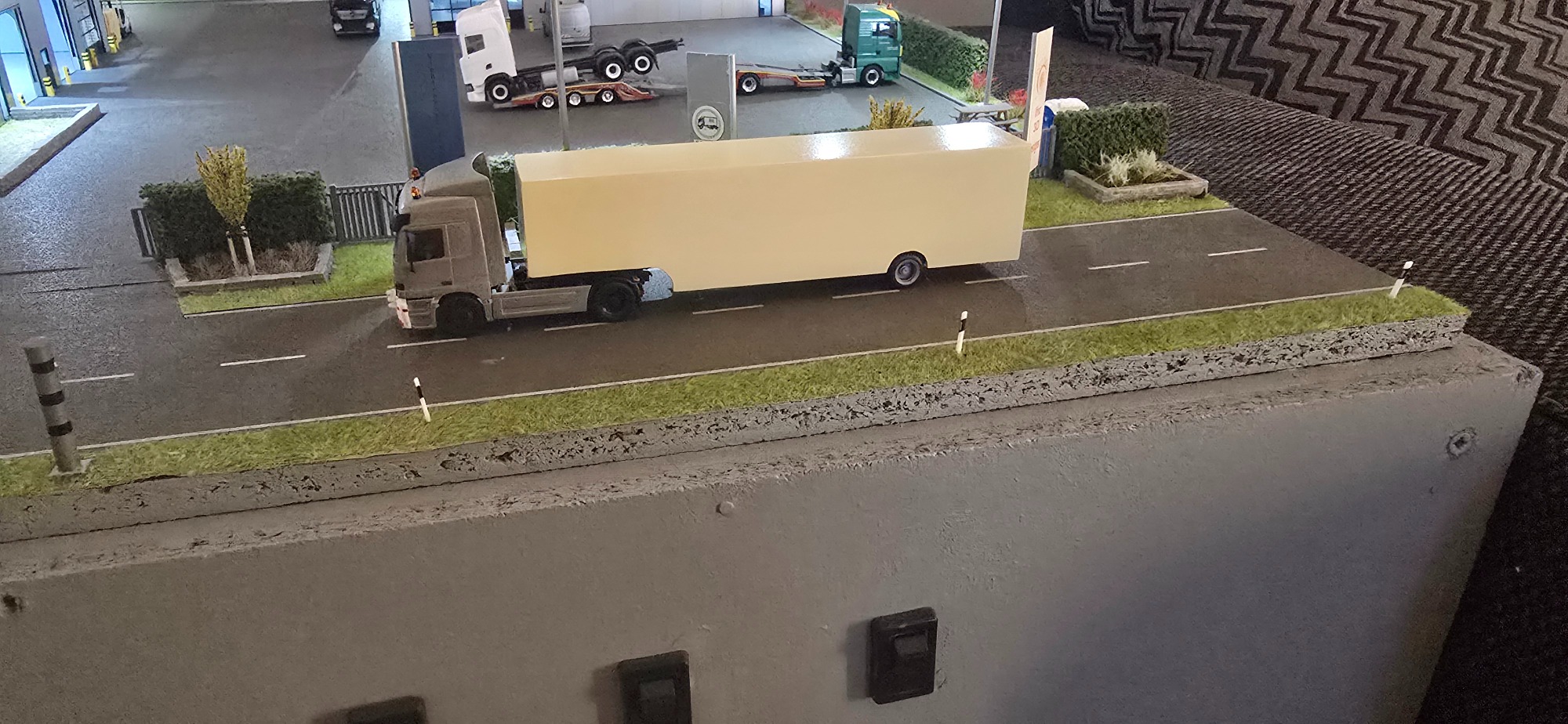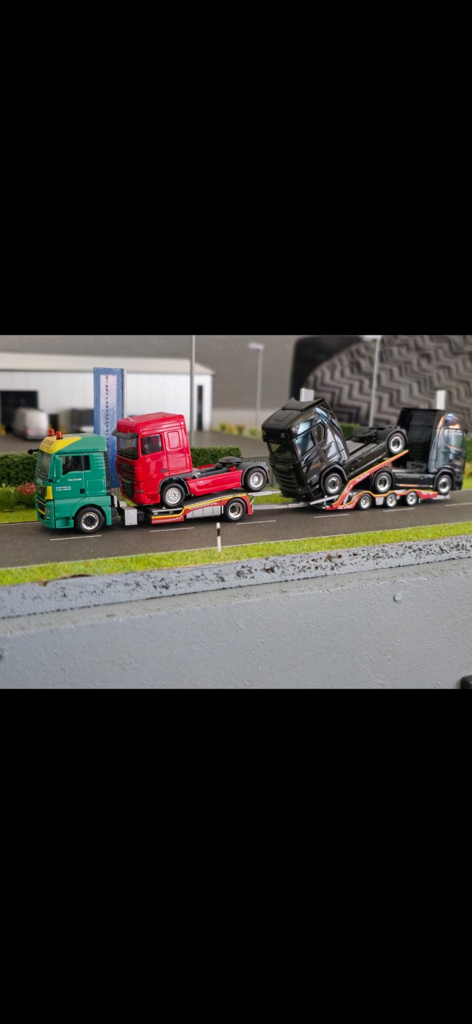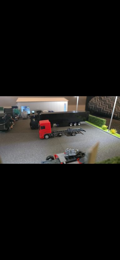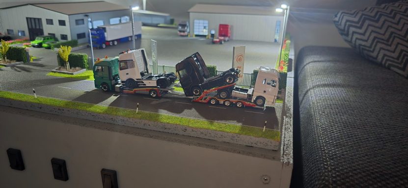Das ist Modell Nummer 2 was ich gebaut habe. Daniel schrieb mir eine Nachricht über Facebook. Er hätte auch gerne ein Modell von seinen Lkw. Im ersten Moment war ich nicht sehr angetan von der Farbkombination , habe mich immer wieder lustig drüber gemacht. Weil es eine sehr seltene und merkwürdige Farbkombination war. Ich wollte mich selbst überzeugen von dem Lkw also habe ich mit Daniel ein Termin vereinbart. Ich habe mich eine Woche später auf den Weg gemacht nach Daniel. Er hat mir viel erzählt und gezeigt, habe dann auch im Gegenzug viele Bilder gemacht für die Decals. Ich habe dann gesagt machen wir. Also habe ich teile bestellt wie immer halt . Diesmal war es ein 4 Stock Menke Aufbau den Sebastian A. extra Zeichnen musste weil es bislang nur einen 3 Stock gab. Auch der Anhänger musste umgezeichnet werden , da ich bis dahin nur 3 Achser Anhänger hatte . Aber das war für Sebastian kein Problem. Wenige Tage später kam der Aufbau mit der Post bei mir an wie auch die anderen Teile die ich bestellt habe. Als die groben Teile da waren wie Fahrerhaus , Chassi, und Aufbau, habe ich angefangen sie zu grundieren. Aber ich musste ja noch die Farbe bestellen , also schrieb ich Daniel an für die Farbcodes der Farben. Daniel hat schnell geantwortet und gab mir die Farbcodes durch. Dann habe ich die Farben bestellt. In der zwischen Zeit wo die Farbe unterwegs ist , habe ich den Tieflader in 2 Teile geschnitten um eine Achse weg zu schneiden um aus einen 3 Achser einen 2 Achser zu machen. Was mir gut gelungen ist die ganze Sache. Anschließend habe ich ihn zusammen geklebt und grundiert. Tage später kam die Farbe. Da ich kein Lackierprofi bin habe ich den großen Fehler gemacht und habe mit der dunkel roten Farbe angefangen zu lackieren. Was ich halt nicht wusste, also habe ich erst mal weiter gemacht. Habe dann alles fleißig Rot lackiert. Dann kam das Problem mit dem abkleben und dem Gelb. Also rief ich Daniel an wie wir das Desgin von Groß auf klein bekomme. Denn ich kann ja nicht für jedes Modell einen eigenen Aufbau herstellen. Es war ein sehr langes Gespräch mit viel Bilder austauschen, es gab viele varianten aber keine passte so richtig. Nach gefühlt 90 Minuten haben wir eine Lösung gefunden. Am nächsten Tag fing ich an es so abzukleben, wie es mit Daniel besprochen war, immer wieder mit Bilder Austausch. Als er es abgesegnet hat habe ich angefangen es in Schichten zu lackieren. Nach dem das Gelb getrocknet war habe ich das Klebeband abgemacht. Es sah ansich gut aus, bis auf viele Farbläufer. Damit war ich nicht zufrieden. So wollte ich das Modell nicht abgeben. Also rief ich einen Kumpel an der mir helfen sollte der es auch tat. Wir haben uns getroffen angeschaut und einen Schlachtplan gemacht. Ich war um 9 Uhr bei ihm , um 10:30 morgens haben wir angefangen die beiden Aufbauten zu entlacken und zu reinigen, in den kurzen Pausen haben wir immer wieder besprochen wie wir fortfahren. Nach dem reinigen haben wir es geschliffen und grundiert. Da war es 13 Uhr und wir hatten noch viel Arbeit vor uns. Wir hatten keine Zeit für lange Pausen. Wir haben beide Aufbauten gelb lackiert, in vielen dünnen Schichten, weil das Gelb nicht schön zu lackieren war. Als alles gelb war haben wir es trocknen lassen. Es war 16 Uhr und die Arbeit wurde einfach nicht weniger . Nach dem die Farbe trocken war haben wir angefangen abzukleben, für das Rot. Es war sehr mühsam, weil das dünnste Klebeband war 1mm . Irgendwann nach Stunden waren wir fertig mit abkleben. Zu guter Letzt haben wir das Rot lackiert. Langsam wurde es auch schon dunkel draußen und es wurde immer später , irgendwann war es 21 Uhr. Später als wir das Klebeband ab hatten, sah es wirklich gut aus bis auf 1-2 Stellen die man gut und leicht ausbessern konnte. Die Stellen wollte mein Kumpel am nächsten Tag bei Tageslicht ausbessern. Wochen später habe ich dann auch mal mit der Landschaft angefangen. Was schlichtes und einfaches aber dennoch etwas schönes. Das Projekt hat ziemlich lange gedauert aus vielen Gründen. Gefühlt Monate später habe ich die Aufbauten bei meinem Kumpel abgeholt. In der langen Zeit habe ich auch andere Projekte angefangen wie ihr später lesen werdet. Ich habe immer wieder Kleinteile fertig gemacht. Dann habe ich auch Decals für Daniels Modell bestellt um das Modell fertig zu bekommen. Wenige Tage später kamen die Decals an, und habe sie gleich verarbeitet. Habe Daniel immer auf dem laufenden gehalten. Als das Modell fertig war habe ich ihn angerufen und er hat sich sehr gefreut, also haben wir einen Termin ausgemacht zur Übergabe. Knapp 3 Wochen später fuhr ich dann zu ihm und übergab es ihm. Er freute sich tierisch wie ein kleiner Junge, was mich natürlich auch sehr freute.