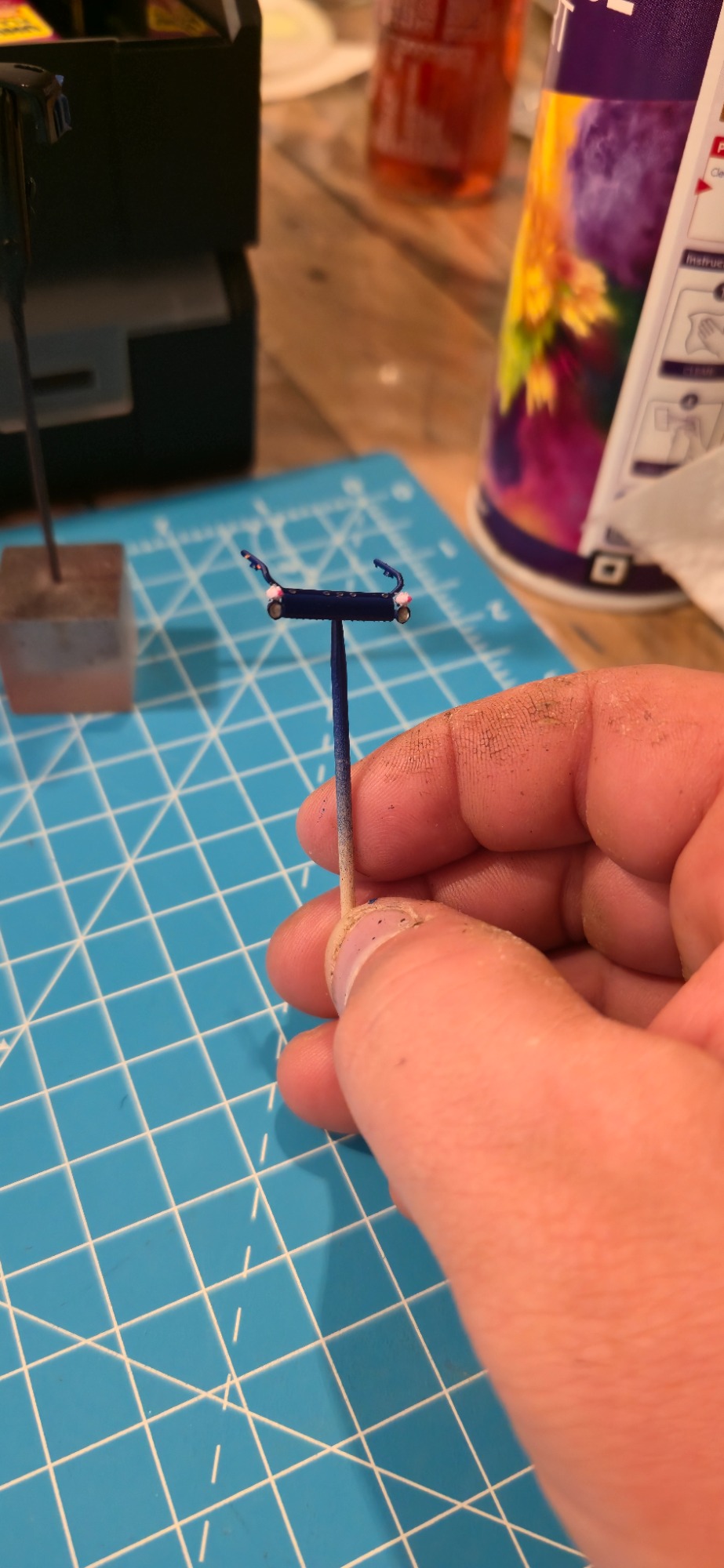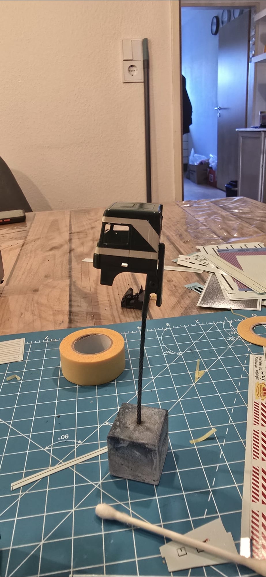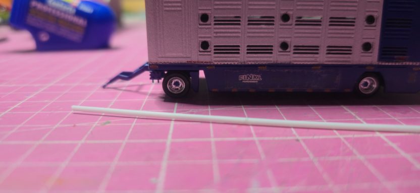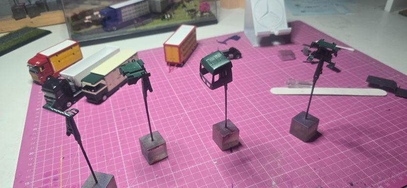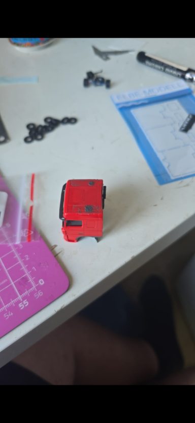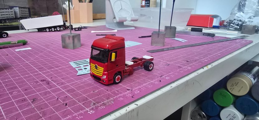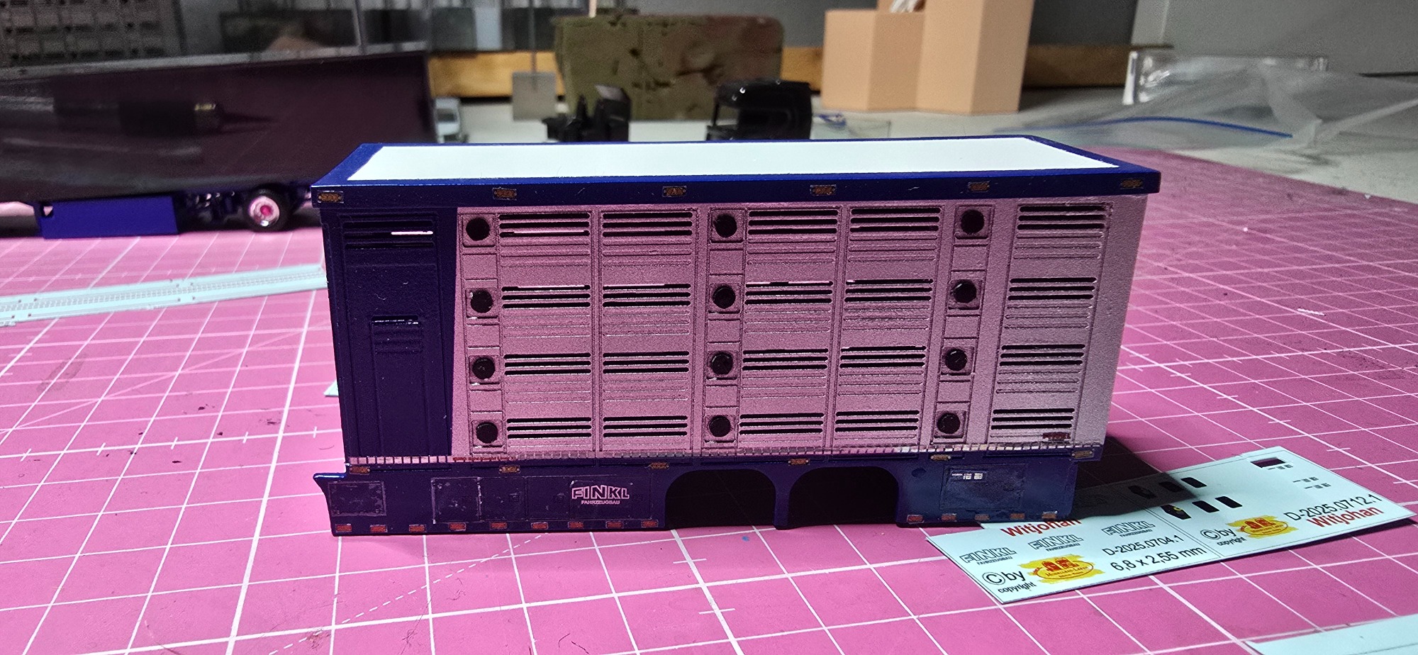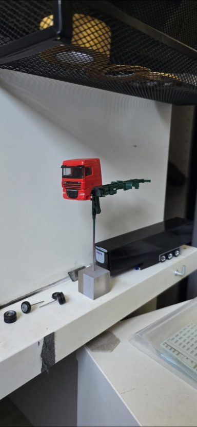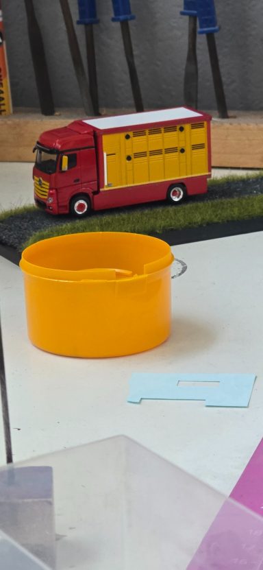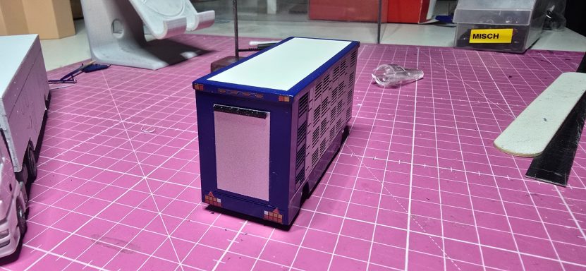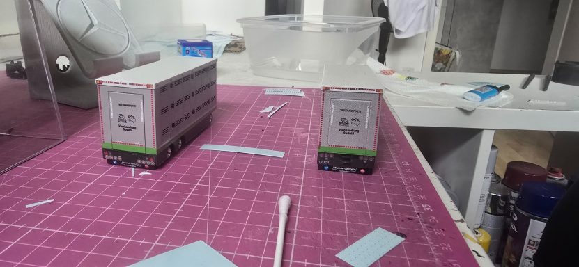 Dieses Projekt kam durch einen Zufall zustande, weil ich mit Kevin. S das Geschenk für Alina und Andy. S geholt habe. Im Gespräch kamen wir dann auf das Thema Modellbau und habe Bilder gezeigt. Ralf war begeistert und wollte auch eins haben. Natürlich konnte ich nicht nein sagen. Also habe ich auch direkt Bilder gemacht aber nur Grob. Ralf hat mir auch direkt Farbe zugeschickt in Sprühdosen, so mit musste ich mich um Farbe kümmern , ich habe mich dann um Teile gekümmert, wie Fahrerhaus und Co. Der Aufbau lies auf sich warten , da er neu Gezeichnet werden musste da es ja zu einer neun Aufbau version kam mit mehr Tiefe und kanten. Als die üblichen Teile da waren habe ich schon mal damit begonnen sie zu Lackieren. Ich habe auch mich auch schon um kleinteile wie Lampenbügel gekümmert .Mit der Zeit kam dann die Aufbauten dann habe ich sie zusammen geklebt und Grundiert. Nach dem ich das getan habe , habe ich wenige Tage später die Klebestellen nach geschliffen und neben bei mir die Bilder von Ralf s Lkw angeschaut wie er lackiert ist um es mir auf meinen Modell anzuschauen. Dann habe ich schon mal die Grundfarbe Silber aufgetragen und es durch Trocknen lassen. Dann habe ich das Dach weiß lackiert. Ein paar Tage später habe ich den Aufbau und das Dach angeklebt um das Blau zu Lackieren. Es hat sehr gut geklappt was mich gefreut hat , natürlich habe ich davon auch Bilder gemacht und sie Ralf geschickt und in meiner Gruppe auf Facebook gezeigt und auch auf Insta. Da ich immer Decals auf Vorrat kaufe um es überall verwenden zu können habe ich mit den Rücklichtern , Begrenzungsleuchten und Reflexstreifen schon schon mal angefangen. Das lief gut von der Hand. Ich habe mich inzwischen mit Markus in verbindung gesetzt wegen dem Lampenbügel als extra anfertigung , da der Ralf mini Schweine an seinen Lampenbügel hat , wo eig Rundumleuchten sind. Paar Tage später schickte Markus mir ein Bild davon ich war begeistert und musste es auch direkt an Ralf weiterleiten. Er fand es mega cool. Mit der Landschaft von Ralf war ich schon fertig, da sie eig für jemand anderes gedacht war der sich nicht mehr gemeldet hat. Also habe ich Ralf gefragt ob er sie gerne übernehmen möchte und er war damit einverstanden. Es ging auch mal wieder weiter mit Ralf sein Modell ich habe in letzter Zeit seinen Lampenbügel drucken lassen und Farblich angepasst. Natürlich ging es auch mit dem Decals voran so weit das nur noch die Heckklappen und Fahrerhaus gemacht werden muss. Ich habe auch schon die weißen Rollen angebracht an der Lkw Heckklappe.
