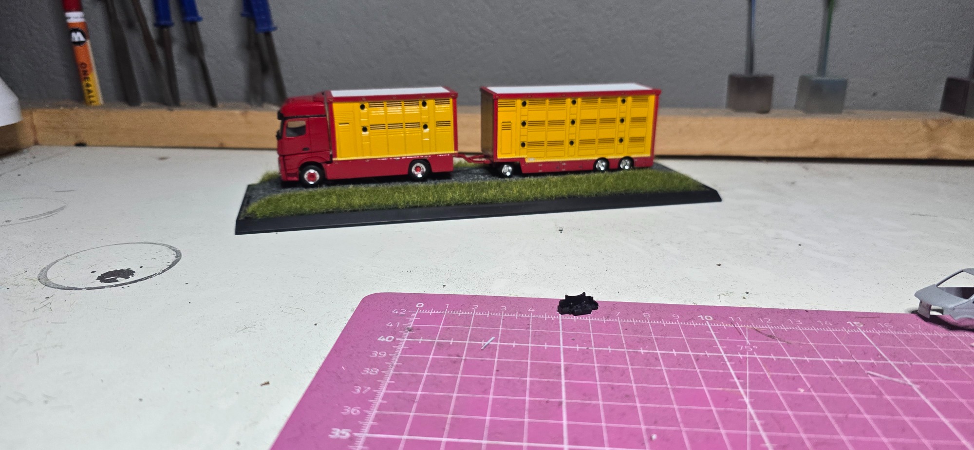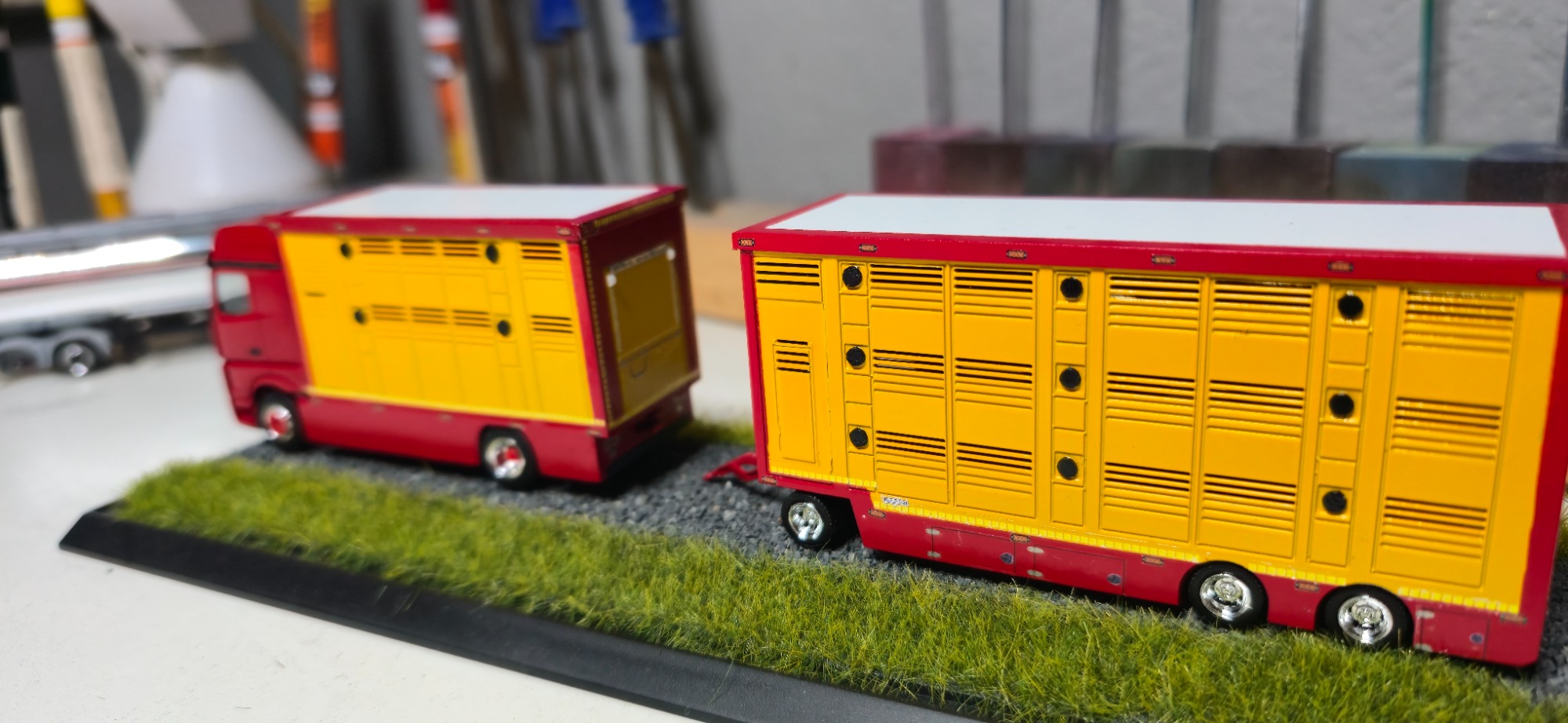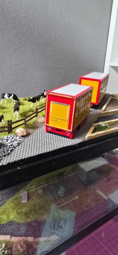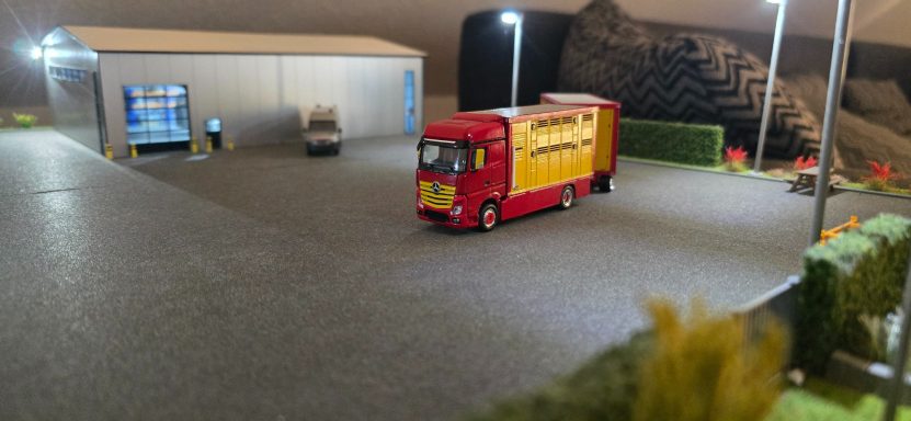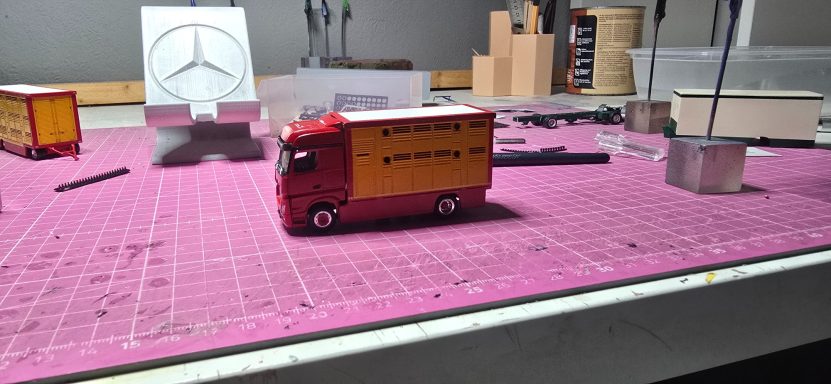 Das war meine erste Anfrage für ein Modell. Es fing an mit der Teile Beschaffung. Die leicht von Hand ging. Viel schlimmer war es den richtigen Farbton zu kriegen, da es ja mein erstes Modell war. Aber auch das klappte irgendwann. In der Lieferzeit von den Teilen habe ich dann angefangen den Aufbau zusammen zukleben und zu schleifen. Als ich das gemacht habe , habe ich mich immer wieder mit den originalen Bilder beschäftigt, um zu vergleichen. Nun als endlich das Fahrerhaus sowie das Chassi und der Tieflader da waren , habe ich eine probe Stellung gemacht. Die gar nicht so schlecht war bis dahin. Dann habe ich angefangen die Teile zu Grundieren . Nach und nach habe ich sie dann Schichtweise lackiert, um erstmal ein Gefühl dafür zu bekommen wie es mit der Sprühdose funktioniert. Die ersten versuche waren zaghaft aber gut . Während ich das Fahrerhaus lackiert habe wie auch die Aufbauten , hab ich mich immer wieder mit den Kleinteilen beschäftigt wie (Zuschneiden, kleben , Grundieren und lackieren oder Pinseln) . Ich war auch immer wieder im Kontakt mit Stefan wegen Bildern und Infos . Als ich alles in Rubyred lackiert hatte, habe ich mit dem abkleben für das Aluminium Silber angefangen. Aber das ging einfach und schnell. Also gesagt getan Abgeklebt und lackiert. Natürlich in mehreren Schichten das habe ich trocknen lassen. Für die Decals brauchte ich ja Bilder vom Lkw , also setzte ich mich mich Stefan in Verbindung. Wenige Tage später haben wir uns getroffen für einen Plausch und Bilder und Kaffee . Dann habe ich aus den Bildern Decals erstellen lassen. Was auf anhieb gar nicht so leicht war für den Grafiker der eigentlich täglich Decals erstellt , da die Viehtransporter kein Standartprodukt war wie bei einen gewöhnlichen Auflieger. Mit dem ich mich dann auch Persönlich getroffen habe um alles zu besprechen, und Maße auszutauschen. Gefühlt 3 Monate später kamen dann auch die ersten Decals . Es passte auf anhieb sehr viel davon, wobei wir einige Sachen auch überarbeiten mussten. In der weiteren Wartezeit habe ich mich dann mit der Gestaltung der Landschaft beschäftigt. Irgendwann später kamen die neuen Decals zum verarbeiten. Und dann ging alles auch sehr schnell . Decals dran Klarlack drüber und Kleinteile dran. Zuallerletzt wurde das Modell auf die Landschaft geklebt . Als ich fertig war ging es dann wenige Tage später zum Stefan. Bei der übergabe hat er sich sehr gefreut. Was mich natürlich auch sehr gefreut hat......