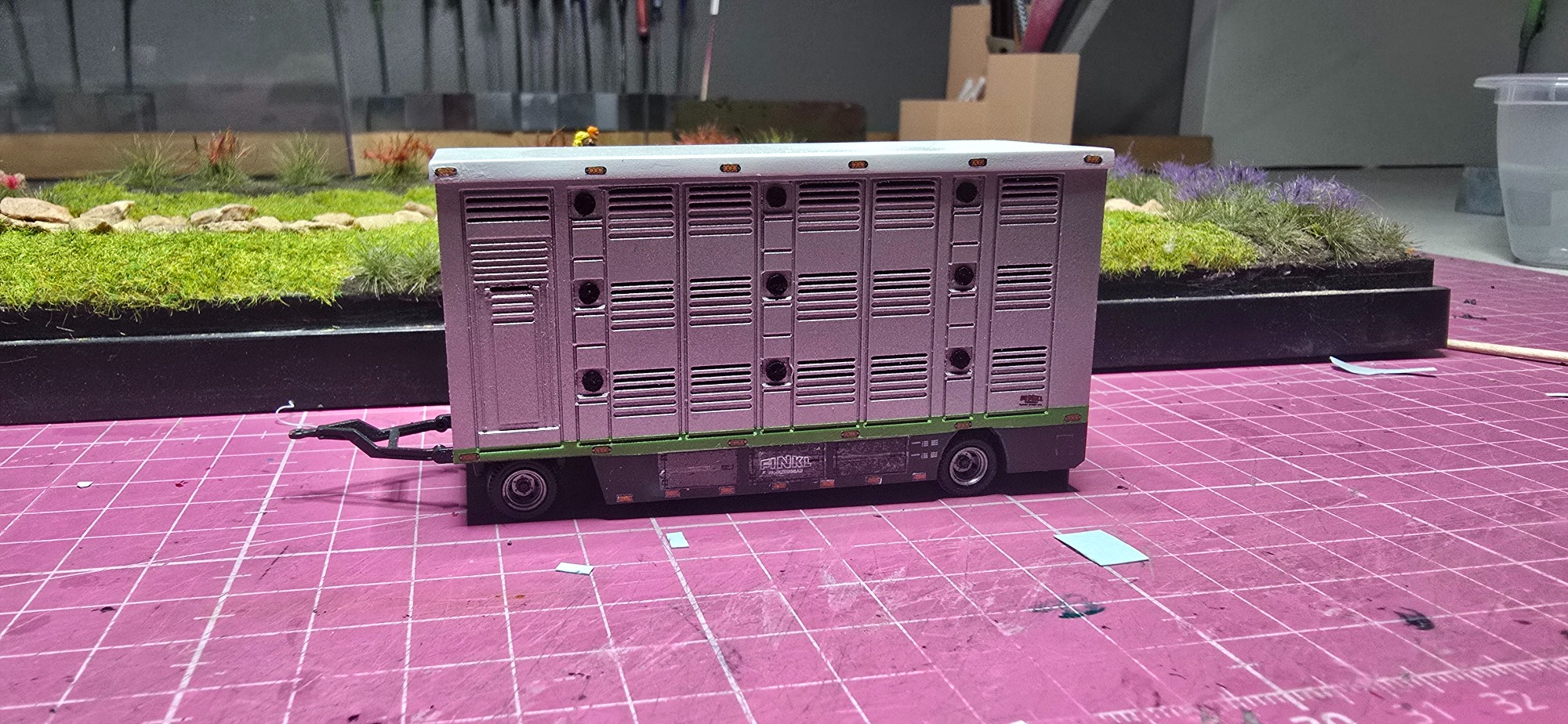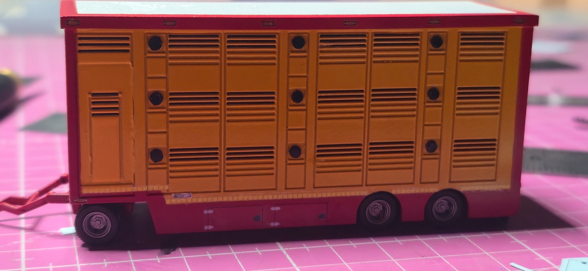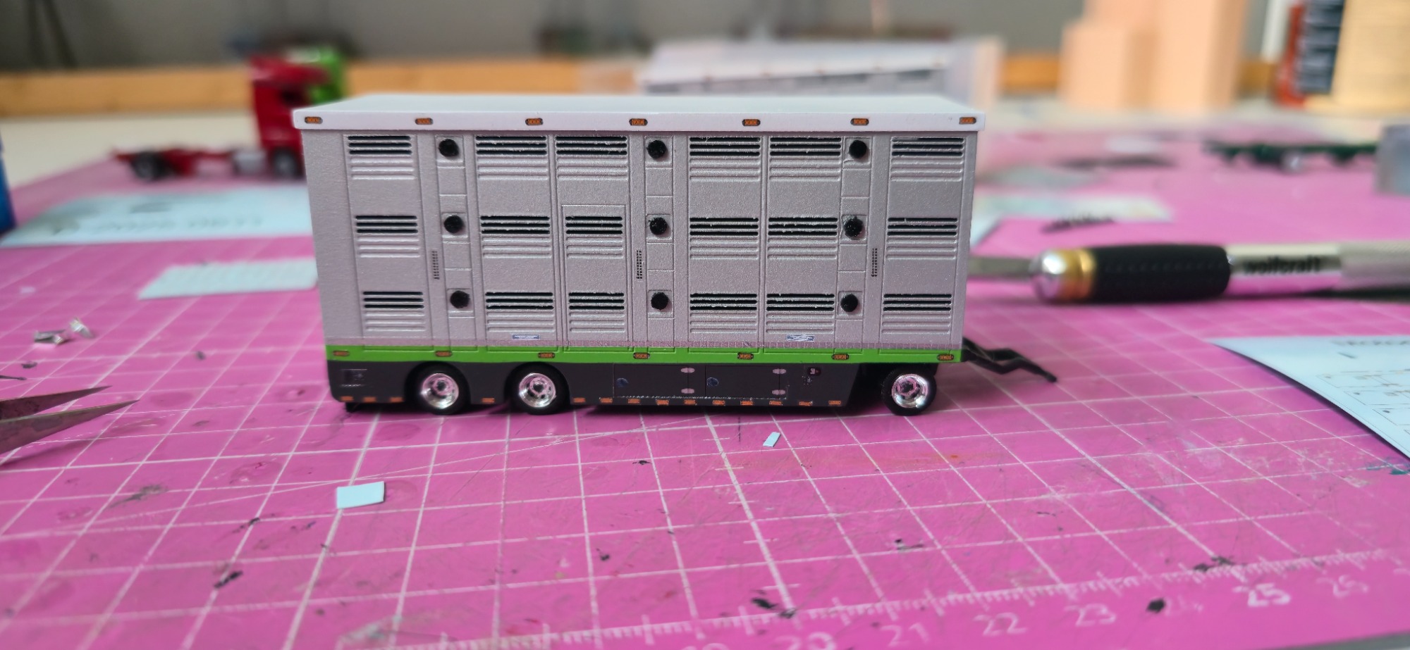 Das war meine erste Anfrage für ein Modell. Es fing an mit der Teile Beschaffung. Die leicht von Hand ging. Viel schlimmer war es den richtigen Farbton zu kriegen, da es ja mein erstes Modell war. Aber auch das klappte irgendwann. In der Lieferzeit von den Teilen habe ich dann angefangen den Aufbau zusammen zukleben und zu schleifen. Als ich das gemacht habe , habe ich mich immer wieder mit den originalen Bilder beschäftigt, um zu vergleichen. Nun als endlich das Fahrerhaus sowie das Chassi und der Tieflader da waren , habe ich eine probe Stellung gemacht. Die gar nicht so schlecht war bis dahin. Dann habe ich angefangen die Teile zu Grundieren . Nach und nach habe ich sie dann Schichtweise lackiert, um erstmal ein Gefühl dafür zu bekommen wie es mit der Sprühdose funktioniert. Die ersten versuche waren zaghaft aber gut . Während ich das Fahrerhaus lackiert habe wie auch die Aufbauten , hab ich mich immer wieder mit den Kleinteilen beschäftigt wie (Zuschneiden, kleben , Grundieren und lackieren oder Pinseln) . Ich war auch immer wieder im Kontakt mit Stefan wegen Bildern und Infos . Als ich alles in Rubyred lackiert hatte, habe ich mit dem abkleben für das Aluminium Silber angefangen. Aber das ging einfach und schnell. Also gesagt getan Abgeklebt und lackiert. Natürlich in mehreren Schichten das habe ich trocknen lassen. Für die Decals brauchte ich ja Bilder vom Lkw , also setzte ich mich mich Stefan in Verbindung. Wenige Tage später haben wir uns getroffen für einen Plausch und Bilder und Kaffee . Dann habe ich aus den Bildern Decals erstellen lassen. Was auf anhieb gar nicht so leicht war für den Grafiker der eigentlich täglich Decals erstellt , da die Viehtransporter kein Standartprodukt war wie bei einen gewöhnlichen Auflieger. Mit dem ich mich dann auch Persönlich getroffen habe um alles zu besprechen, und Maße auszutauschen. Gefühlt 3 Monate später kamen dann auch die ersten Decals . Es passte auf anhieb sehr viel davon, wobei wir einige Sachen auch überarbeiten mussten. In der weiteren Wartezeit habe ich mich dann mit der Gestaltung der Landschaft beschäftigt. Irgendwann später kamen die neuen Decals zum verarbeiten. Und dann ging alles auch sehr schnell . Decals dran Klarlack drüber und Kleinteile dran. Zuallerletzt wurde das Modell auf die Landschaft geklebt . Als ich fertig war ging es dann wenige Tage später zum Stefan. Bei der übergabe hat er sich sehr gefreut. Was mich natürlich auch sehr gefreut hat......