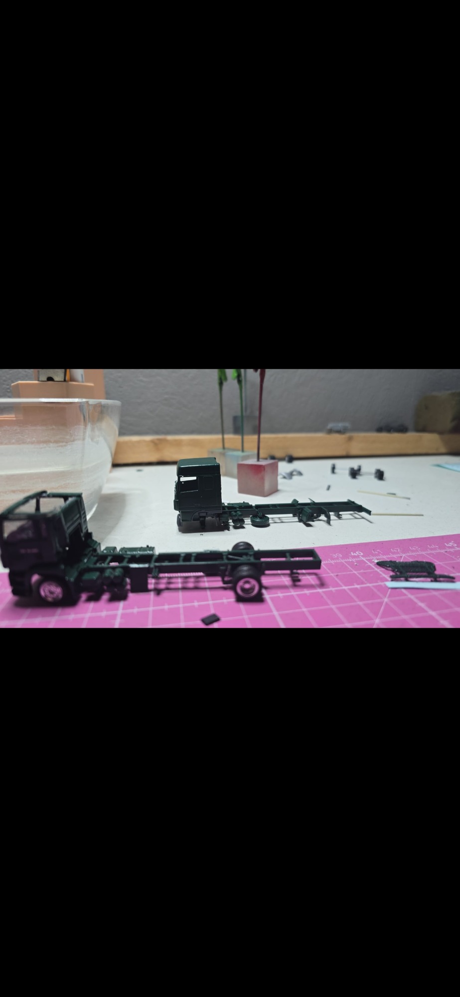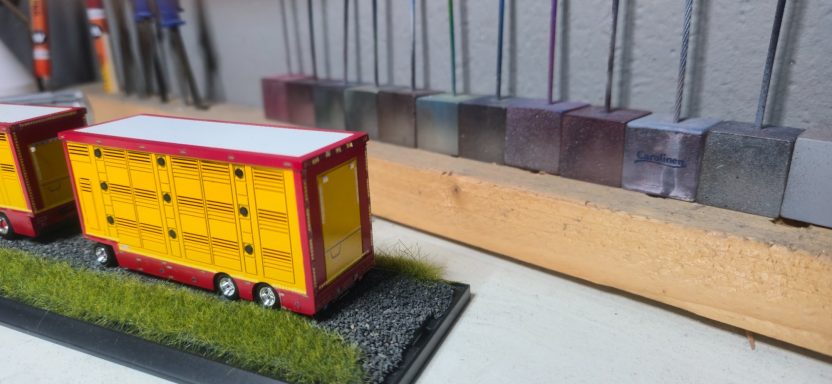 Hier kam eine sehr ungewöhnliche Anfrage von Maik . Er fragte mich ob ich auch Pferdetransporter baue. Ich habe die Herausforderung angenommen. Ich dachte mir es kommt mir zu gute wenn ich auch andere Tiertransporter anbieten kann. Wochen später nach der Anfrage haben wir uns mal getroffen nach meinen Feierabend. Wir haben gesprochen und ich habe mir seinen Lkw genau angeschaut und viel gefragt. Damit ich weiß welche Teile ich brauche. Ich habe sofort gemerkt das ich die Aufbauten selbst machen muss. Einige Tage später habe ich die üblichen Bauteile bestellt , wie Tieferlader , Fahrerhaus, und einen 2 Achschassi. Ich habe mir dann auch 1mm starke Evergreen Platten bestellt um die Aufbauten zu Bauen. Als die Sachen ankamen habe ich sie erstmal grob zusammen gebaut und zusammen gesteckt. Beim Treffen mit Maik habe ich mir natürlich auch die Farbnummern geben lassen und die Farben bestellt. Wo die Farbe da war habe ich schon mal das Lkw chassi lackiert, in Grün. Dann habe ich das Fahrerhaus aufs Chassi gesteckt und auch die Reifen angesteckt um die Höhe zu ermitteln und zu messen. Nach den Maßen die ich gemessen habe , habe ich dann Platten zu geschnitten zum Rechteck . Die Radaussparung habe ich dann anschließend angezeichnet und mit einen Cuttermesser raus geschnitten so weit es möglich war. Den Rest habe ich dann mit einer Pfeile oder Schleifpapier gemacht. Als ich mit dem ersten Teil fertig war habe ich es dran gehalten um zu gucken ob es passt. Es waren kleine nach Arbeiten nötig . Also habe ich das erste Teil als Schablone benutzt und das zweite Teil angefertigt. Ich war sehr zufrieden , also habe ich mich an das Dach und Stirn/Rückwand begeben was recht einfach war. Dann habe ich alles zusammen geklebt, alles mit einen Winkel kontrolliert, damit alles zusammen passt. Den Tieflader habe ich durchtrennt und schmaler geschnitten. Ich habe mir gedacht, den Anhänger genau so lang wie den Lkw zu machen, damit es dann einfacher ist mit den Decals. Ich habe dann die Teile für den Anhänger angefertigt und zusammen geklebt. Anschließend habe ich beide Aufbauten gespachtelt und geschliffen. Nach dem Schleifen habe ich die Aufbauten, den Tieflader und das Fahrerhaus grundiert. Später habe ich die Aufbauten in Elfenbein lackiert, was super geklappt hat. In der zwischen Zeit habe ich dann auch mit der Landschaft angefangen und sie in kürze fertig gestellt. Ich habe dann angefangen den Lkw Aufbau abzukleben um ihn dann stellenweise grün zu Lackieren. Es lief alles ganz gut bis zu dem Punkt als ich das Klebeband abzog und sich das Elfenbein mit ablöste. Also alles auf neu . Beim zweiten mal Lackieren ging es ohne Schäden zu. Maik schrieb mich auch zwischen durch an um nach zu fragen wie es läuft. Natürlich auch um seine Wünsche zu äußern wie z.B. eine Satschlüssel oder ein Hund der aus dem Fenster schaut. Durch die Fotos die ich beim Treffen gemacht habe, habe ich Decals erstellen lassen. In der Wartezeit der Decals habe ich den Anhänger lackiert. Als die Decals da waren habe ich versucht sie zu verarbeiten. Es war schwieriger als Gedacht, ich musste sie viel trennen und teilen. Ich musste auch Decals ändern lassen und neu bestellen, weil es am Ende einfacher war / ist alles einzeln auf zu tragen als ein komplettes Stück. Der Anhänger ging dann schneller von statten mit den Decals, weil ich dann wusste wie es am besten geht. Nach einigen Monaten war ich dann auch fertig mit den Decals . Dann habe ich die Kleinteile fertig gemacht und habe alles zusammen gebaut. Als ich fertig war habe ich mich wieder mit Maik getroffen, zur Übergabe. Er war sehr zufrieden und freute sich über die vielen Kleinigkeiten, was mich auch sehr freute alles Richtig gemacht zu haben.