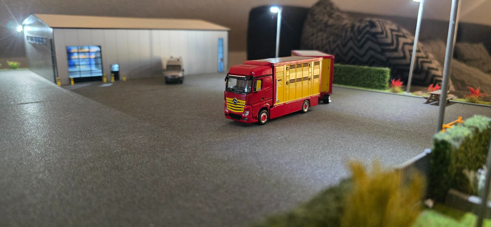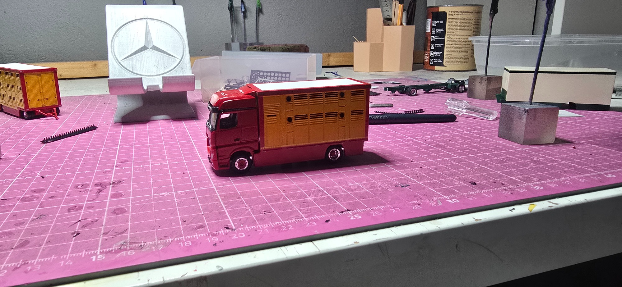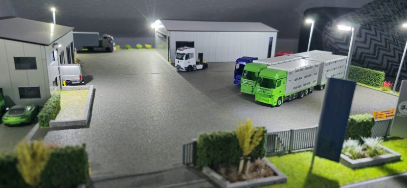 Der Guido hat mich letztes Jahr auf dem Truck Grand-Prix gefragt ob ich sein LKW nach Bauen kann als Modell. Ich habe ihn gesagt mit viel Geduld sehr gerne. Auf dem 50 Geburtstag von Daniel Keller sind wir noch mals ins Gespräch gekommen. Wochen später haben ich dann auch angefangen Sachen zu bestellen. Wie ihr ja mittlerweile wisst Fahrgestell und Tieflader , Fahrerhaus sind immer schnell da. Die Aufbauten kamen Tage später auch, weil die Zeitgleich mit den Aufbauten vom Sudahl kamen. Aber ich habe erstmal mit der Landschaft angefangen. Schlicht und einfach war der Gedanke, aber es wurde ein wenig aufwendig, da ich wieder Mauern gezogen habe. Da der Guido viel groß Vieh Fährt habe ich ne Wiese mit Kühe gemacht. Als der Grund so weit fertig war habe ich dann auch erstmal mit dem Lkw begonnen , wie Fahrerhaus und Fahrgestell und Tieflader zu Grundieren und Rot zu lackieren. Dann habe ich die Aufbauten sauber gemacht und zusammen geklebt. Paar Tage später habe ich die Klebe stellen nach geschliffen und die Aufbauten Grundiert. Dabei habe ich Guido auf dem Laufenden gehalten. Er freute sich über jede Neuigkeit die passiert ist , das sind immer Rückmeldungen die einen gefallen und gut tun. Nach dem ich die Aufbauten grundiert hatte brauchten sie auch mal Farbe also Lackierte ich den Aufbau komplett gelb. Aber dieses Gelb wollte ich nicht so wie ich wollte es Deckte nicht so wie ich es wollte , das Problem kannte ich ja schon vom Daniel Kellers Modell. Da hatte ich das Problem auch also musste ich versuchen viele dünne Schichten aufzutragen. Dieses Gelb hat mich viel nerv gekostet, aber ich denke das ergebniss kann sich sehen lassen. Habe es dann einige Tage Ruhen lassen. In der Ruhe Phase habe ich ihn mal angeschrieben ob er mir mal ein paar Bilder zu kommen lassen kann, dies war natürlich kein Problem was mich freute. Damit ich mir einen kleinen überblick machen konnte vom ganzen wie er so aussieht worauf ich so achten muss. Dann habe ich mich wieder der Landschaft begegeben und weiter zu Ende gebaut mit den Zäunen und dem Kies und der Bepflanzung. Als ich ihm da von Bilder schickte kam er mit einen Wunsch um die Ecke ob man ein Trecker oder einen Mercedes ML dazu stellen könnte, kla sagt ich was wäre dir denn lieber ? Er sagt nen Mercedes in schwarz wäre toll. Also habe ich Ebay und CO durch sucht alles gefunden aber keinen Schwarzen ML . Aber da ich einen Kumpel bei Mercedes habe , habe ich ihn beauftragt dazu gucken und einen herran zu holen. Aber nach keiner Rückmeldung nach vielen Tagen, bin ich dann selbst mal nach Feierabend nach Mercedes gefahren und habe an gefragt. Die junge Frau Begann sofort im PC zu schauen , und wurde fündig und kümmert sich drum das das Modell her kommt. Tage später meldete sie sich und sagte er wäre da zu Abholung. Am gleichen Tag habe ich das Modell noch abgeholt. Abends habe ich davon ein Foto gemacht wie das Modell auf der Landschaft steht. Tage später habe ich dann die Aufbauten abgeklebt damit ich den Roten Rahmen lackieren konnte das hat auf anhieb geklappt bei beiden Aufbauten. Dann habe ich mich mit kleinigkeiten beschäftigt wie Zierleisten malen und so. Dann habe ich Decals bestellt , als ich sie dann hatte habe ich ein Teil der Decals verwenden können. Ich habe das Modell auf Alus gestellt damit es einheitlich ist was auch viel mehr her macht. Da ich ja nur ein Teil der Decals verwenden konnte musste ich noch mal welche bestellen. Aber es dauert immer ein paar Tage mit den Decals also habe ich mich mit den Spiegeln und dem Grill beschäftigt. Während des Lackieren war das Gelb leer , na toll habe ich mir gedacht. Also musste neues her fix bestellt , aber lange lieferzeit weil nicht auf Lager. Als es dann da war wurde sofort wieder weiter Lackiert. Nach dem das Gelb trocken war habe ich die Spiegel halter Schwarz gemalt und das Spiegelglas silber. Zwischen durch habe ich auch schon den Grill Grundiert weil der ja auch Gelb wird. Und ich habe die weißen Rollen an den Klappen angedeutet. Es dauert auch nicht mehr lange dann is es auch fertig.