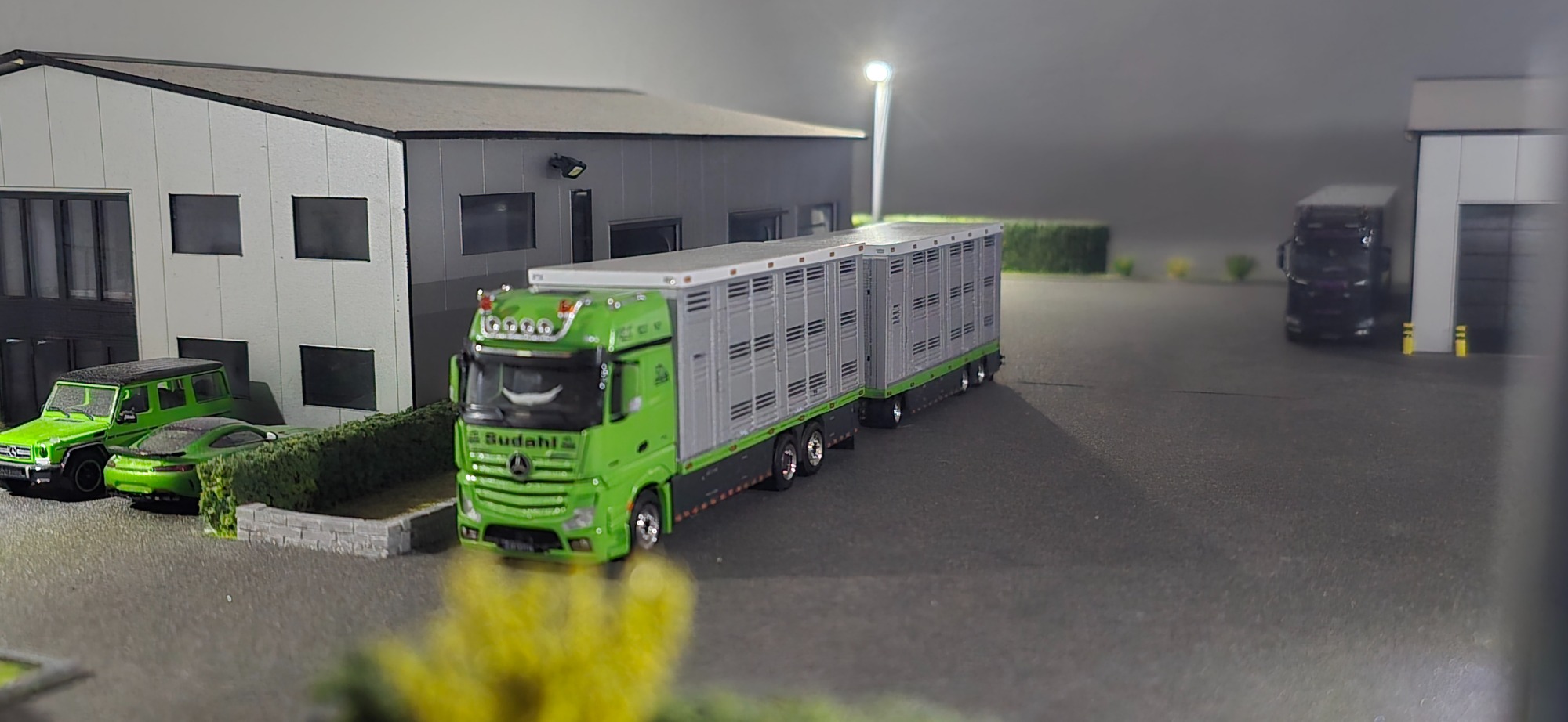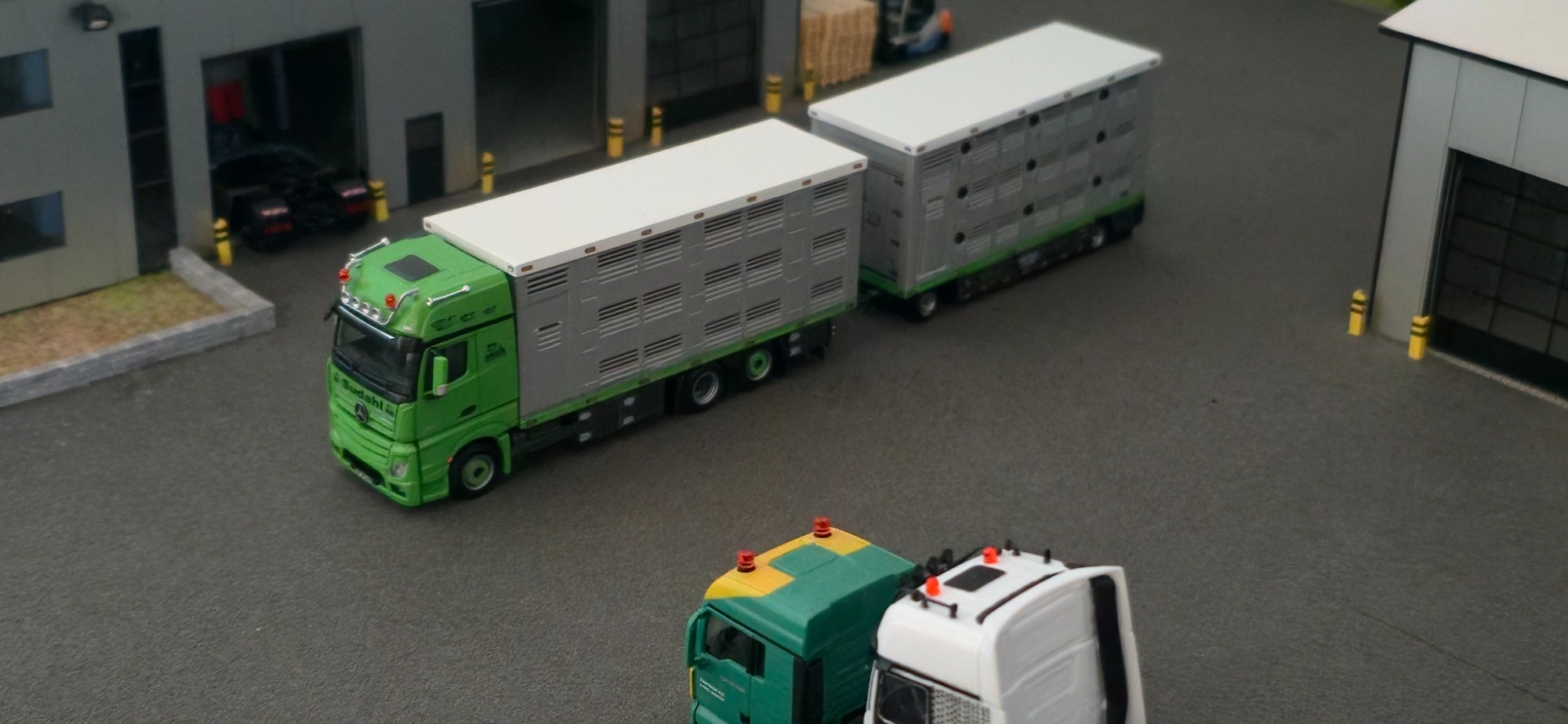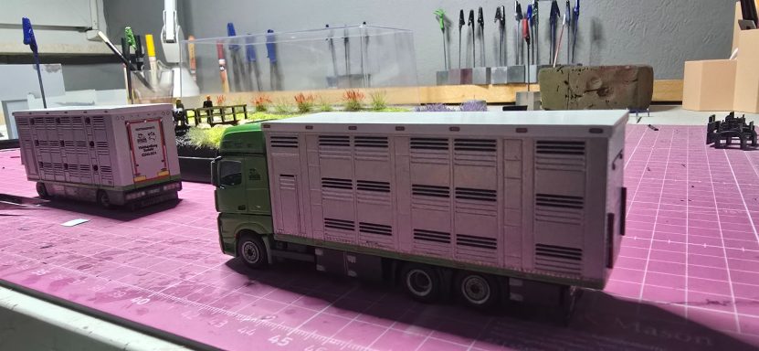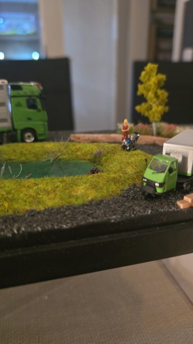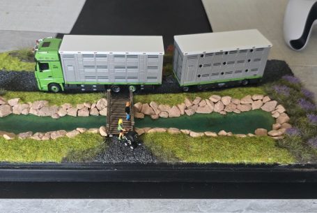 Der Viehfahrer aus dem neben Ort ist auch in meiner Facebook Gruppe und hatte gesehen das ich ein Sattelzug zu verkaufen hatte, was aber nicht in seiner Firmen Farbe war. Da keiner dieses Modell haben wollte frug er mich ob er es Erwerben kann. oder ob man es in seiner Farbe ändern könnte . Na klar kann man das machen , da den eh keiner haben will machen wir das. Also habe ich Teile besorgt, wie die Zugmaschine und einige Kleinteile. Ich habe auch direkt damit angefangen die alte Farbe vom Auflieger zu entfernen. Was auch gut geklappt hat. Da ich auch die Farbcods brauchte habe ich ihn angeschrieben , er sagte ich brauche keine bestellen. Denn er hätte Farbdosen in der Halle.. Also haben wir ein Treffen aus gemacht. Das passte gut mit dem Treffen denn ich brauchte noch Bilder vom Lkw für die Decals. Als ich wieder zu Hause war, habe ich die einzelnen Teile grundiert. Und teils auch Grün lackiert . Den Auflieger habe ich erst mal ein wenig verändert. Und anschließend Grundiert und Silber lackiert, in mehren Schichten. Einige Tage später habe ich das Dach schon mal Weiß lackiert und mit Decals versehen. Ich habe mir die Bilder angschaut und angefangen ab zu kleben nach dem abkleben habe ich den Grünen Streifen lackiert. Tage später habe ich erneut abgeklebt für das Dunkelgrau an der Seitenverkleidung. Diesmal lief das ganze lackieren sehr gut. Bei diesen Projekt habe ich die Decals sehr spät bestellt , aber sie wurden fix geliefert . Bevor ich das Modell fertig gemacht habe, hab ich die Landschaft gebaut. Als ich sie fertig hatte , hab ich das Modell vollendet. Es wurde sich sehr gefreut über das Modell, da es eine Überraschung war. Somit war ich auch zufrieden und glücklich.