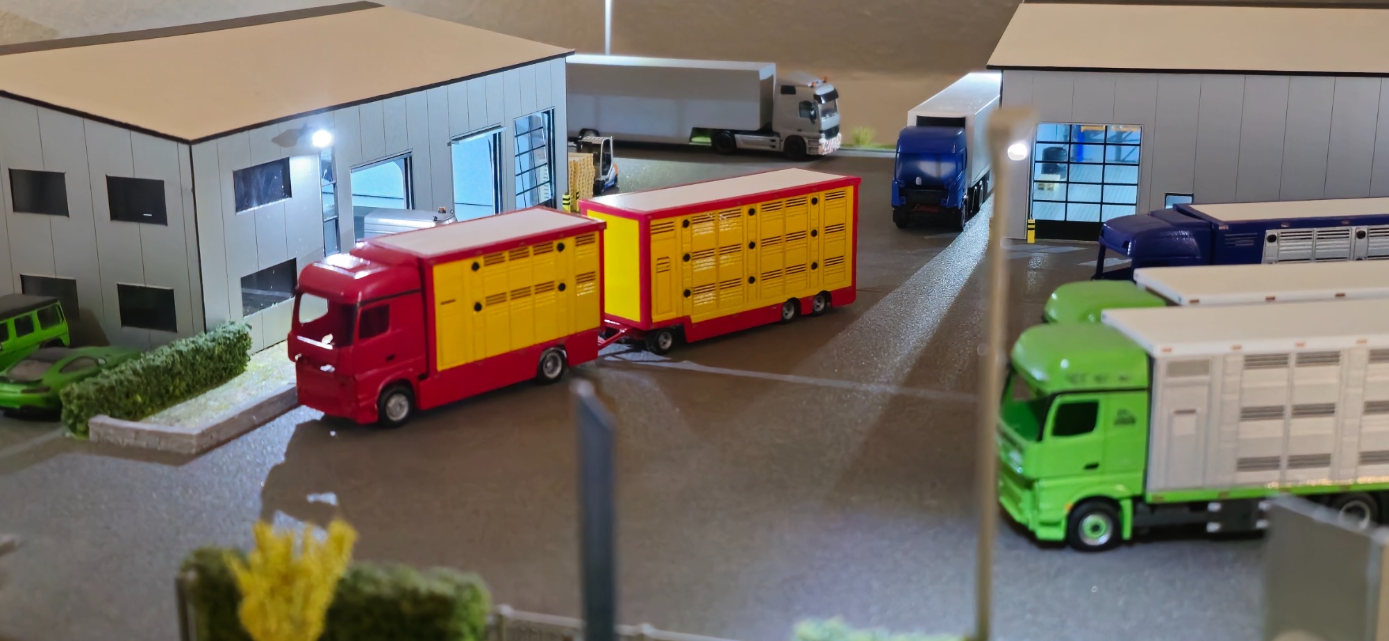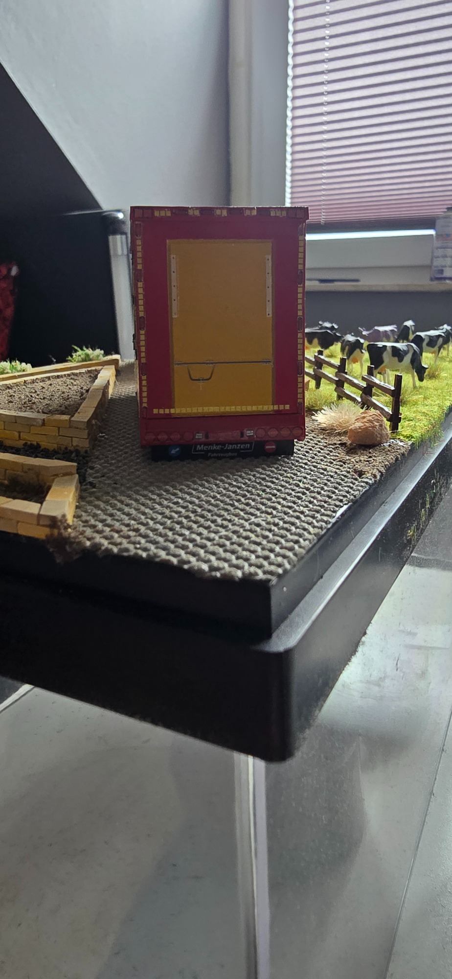 Domenic ein Fahrer Kollege von Maik wollte auch ein Modell von seinen MAN mit kleinen änderungen. Ich habe zu mich um die Teile gekümmert, das Fahrerhaus war kein problem. Das Problem war ein 2 Achs chassi zu finden weil es die nicht mehr so oft gibt. Nach langen suchen und rum fragen habe ich endlich eins gefunden. Bei Domenics Modell habe ich was zum ersten mal versucht , und zwar ein Pferdetransporter mit offenen Türen zu Bauen. Man stellt sich das immer so einfach vor , aber wenn man soweit ist rudert man oft mals wieder zurück weil man nicht genau weiß wie man es machen soll das es genau passt. Also habe ich mich öfter mals nach meinen Feierabend mit Domenic getroffen und mit alles mehr als an zu schauen und fragen zu stellen und kla auch mal ein Bier zu trinken. Ich habe auch immer wieder Bilder gemacht für die Decals, aber auch von innen. Damit ich es gut nach bauen kann. Als die ersten Teile da waren habe ich schon mal damit angefangen teile zu Grundieren und zu lackieren. Diesmal musste ich keine Farbe bestellen da ich noch welche hatte von Maiks und Jans Modell. Zwischen den Trockungs Zeiten habe ich mir eine Zeichnung gemacht vom dem Aufbau wo ich Sägen muss. Zu Hilfe habe ich mir dann noch Rest Decals ausgeschnitten und drauf gelegt um zu schauen ob es so passt. Es sah ganz gut aus zwar nicht ganz so wie bei echten, halt alles bisschen enger. Also begann ich mit dem Zuschneiden der Kunststoff Platten mit den gleichen Maßen wie bei Maiks Modell. Dann habe ich die Decals der Türen ganz genau zu geschnitten, damit sie drauf machen kann zum Anzeichnen um dann wiederum es auszuschneiden. Als die Decals trocken wären habe ich angefangen zu Sägen. Nach dem Auseinander sägen habe ich den Aufbau Grundiert und eine Grundplatte angefertigt. Dabei sind dann auch wieder viele Tage ins Land vergangen. Da musste ich mich auch mal wieder mit Domenic Treffen zum quatschen und so. Nach dem Treffen habe ich dann auch mal mit der Landschaft begonnen die viel Arbeit mit sich brach. Da ich eine Klinker mauer geplant habe als Weiden ab Trennung. Also hieß es Stein für Stein und Reihe für Reihe. Immer Wieder kamen Nachrichten von Domenic mit wünschen und änderungen zum Modell. Ich habe immer alles zu kenntniss genommen und versucht umzusetzen. Als die Landschaft soweit erstmal fertig war. Habe ich weiter gemacht mit dem Modell und es weiter Lackiert. Dann habe ich die Türen angefertigt und grundiert. Nebenbei habe ich Domenic seine wünsche abgearbeitet wie kleinteile und Hunde und Pferde mit bestimmten merkmalen. Ich habe ihn immer wieder auf den Laufenden gehalten und er freute sich immer wie ein kleiner Junge. Dann habe ich die Decals bestellt. Dann habe ich in der Wartezeit der Decals den Aufbau von innen Bemalt und die Laderampen gefertig und bemalt. Es ging in den Endspurt. Ein paar Tage später kamen die Decals und ich habe sie angebracht. Die Decals passten sehr gut und es wirkte alles sehr stimmig von mich sehr freute. Als das Modell fertig war habe ich Domenic bescheid gesagt. Wir haben dann besprochen das wir uns in kürze Treffen, aber es kam, ganz anders als er dachte denn das Modell lag einige Tage später unter dem Weihnachtsbaum. Er freute sich Tierisch , was mich auch sehr freute als ich das Video sah. Und was wars auch mit dem Bericht....